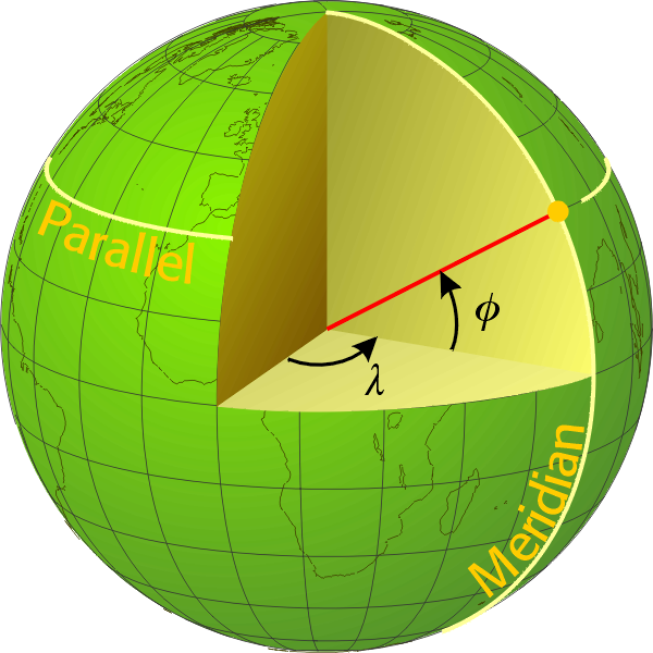 Points with the same latitude form a parallel — think about spinning the earth around while that red knitting needle is held firmly in place at an angle of φ. Points with the same longitude form a meridian — that's what you get when you drop the knitting needle to the equator, down to the south pole and all the way around.